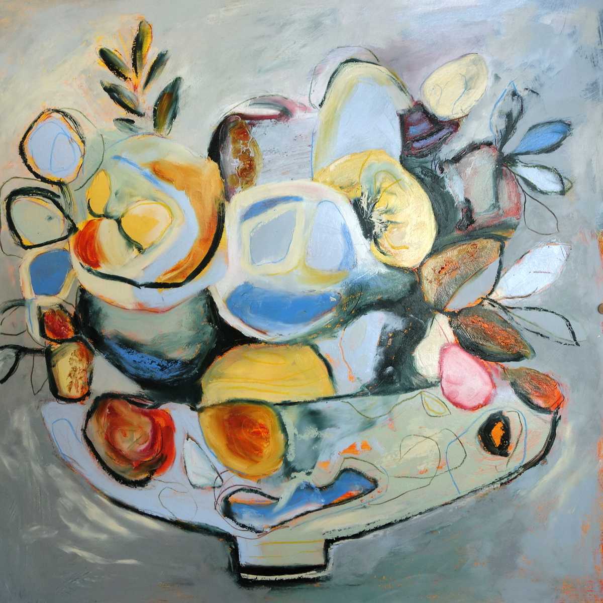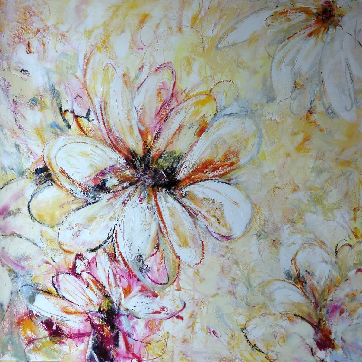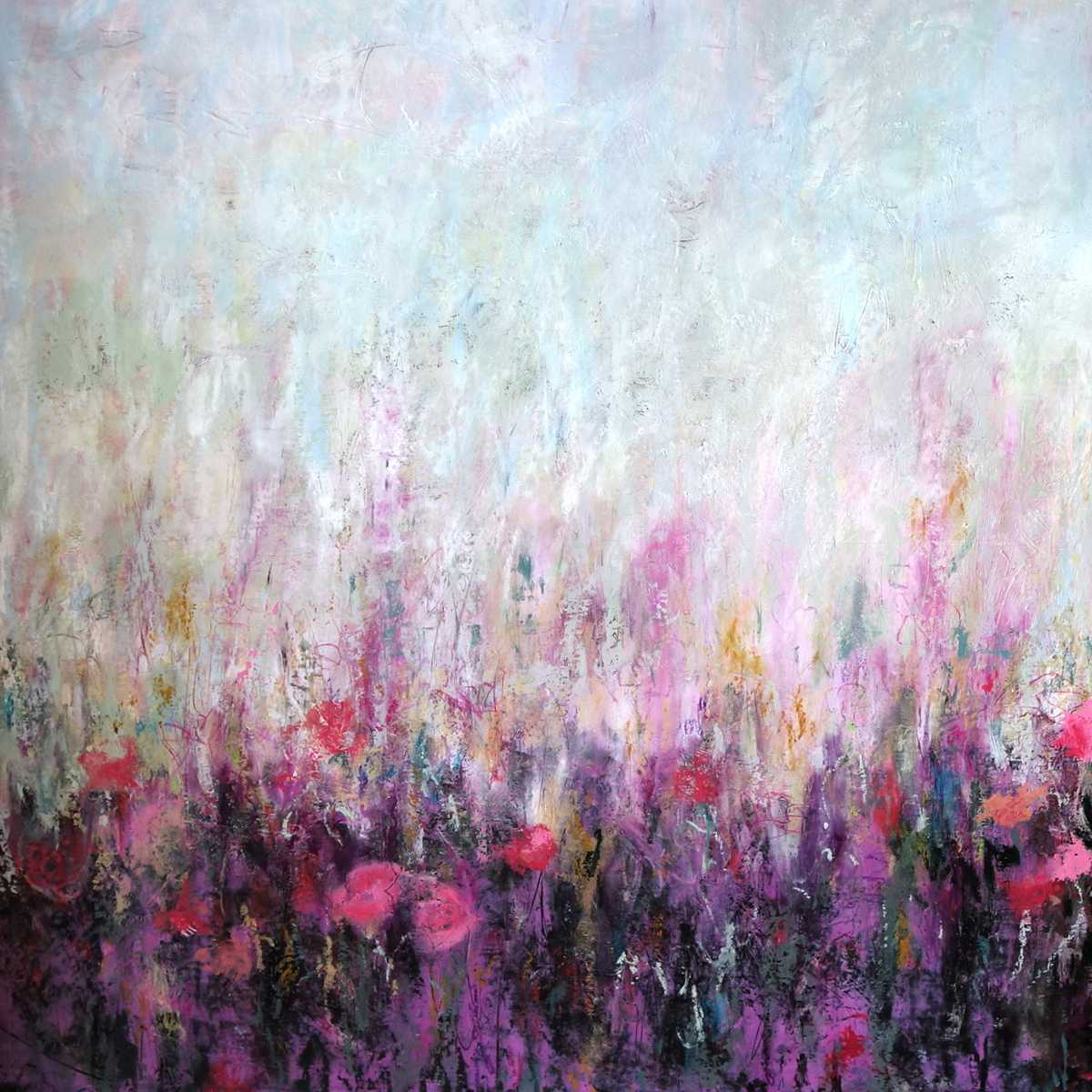 The joyful feeling of intuitive sweeping floral images created with a limited palette is addictive. I start with loose organic drawing in water soluble crayons softened with a wet brush. Oil stick then become the main media building layers of line and texture. These works are mainly large 80cm squares.