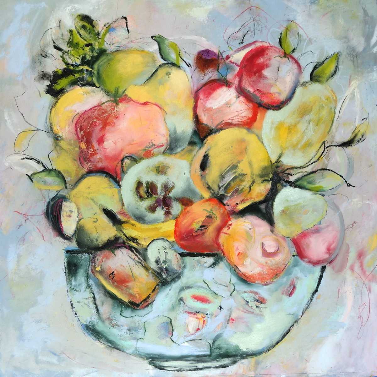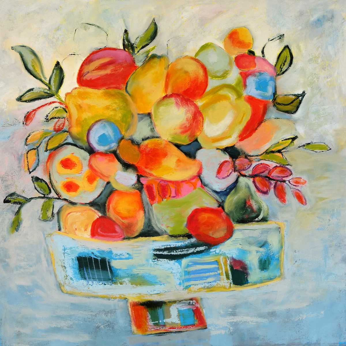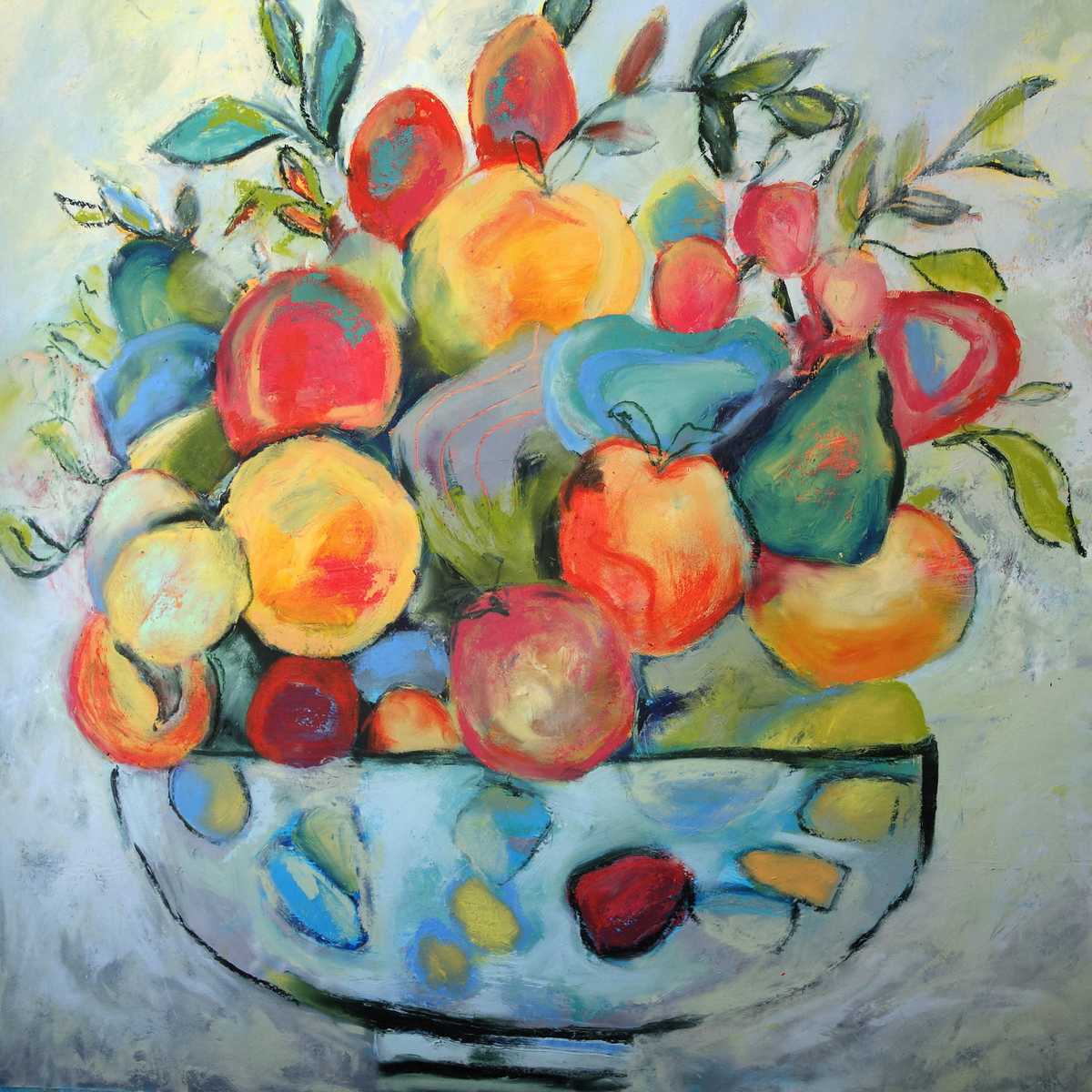 The joyful feeling of intuitive sweeping floral images created with a limited palette is addictive. I start with loose organic drawing in water soluble crayons softened with a wet brush. Oil stick then become the main media building layers of line and texture. These works are mainly large 80cm squares.