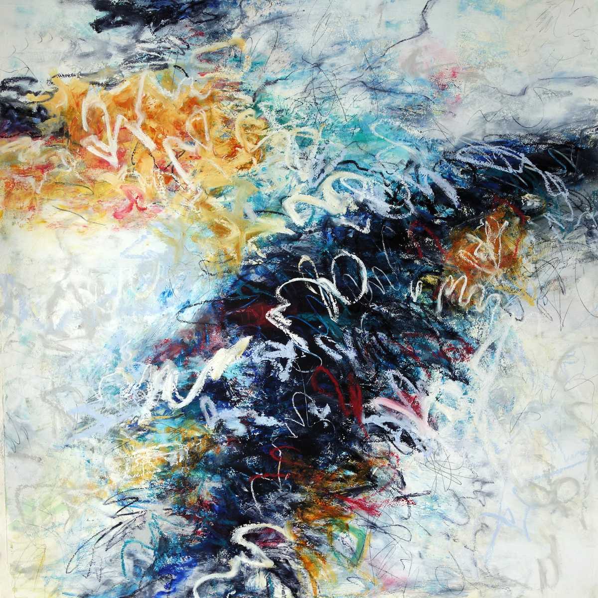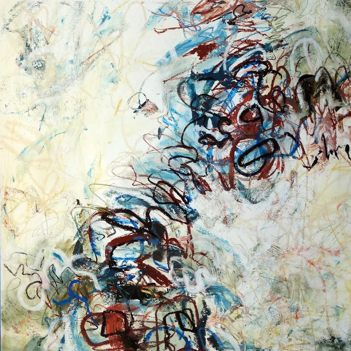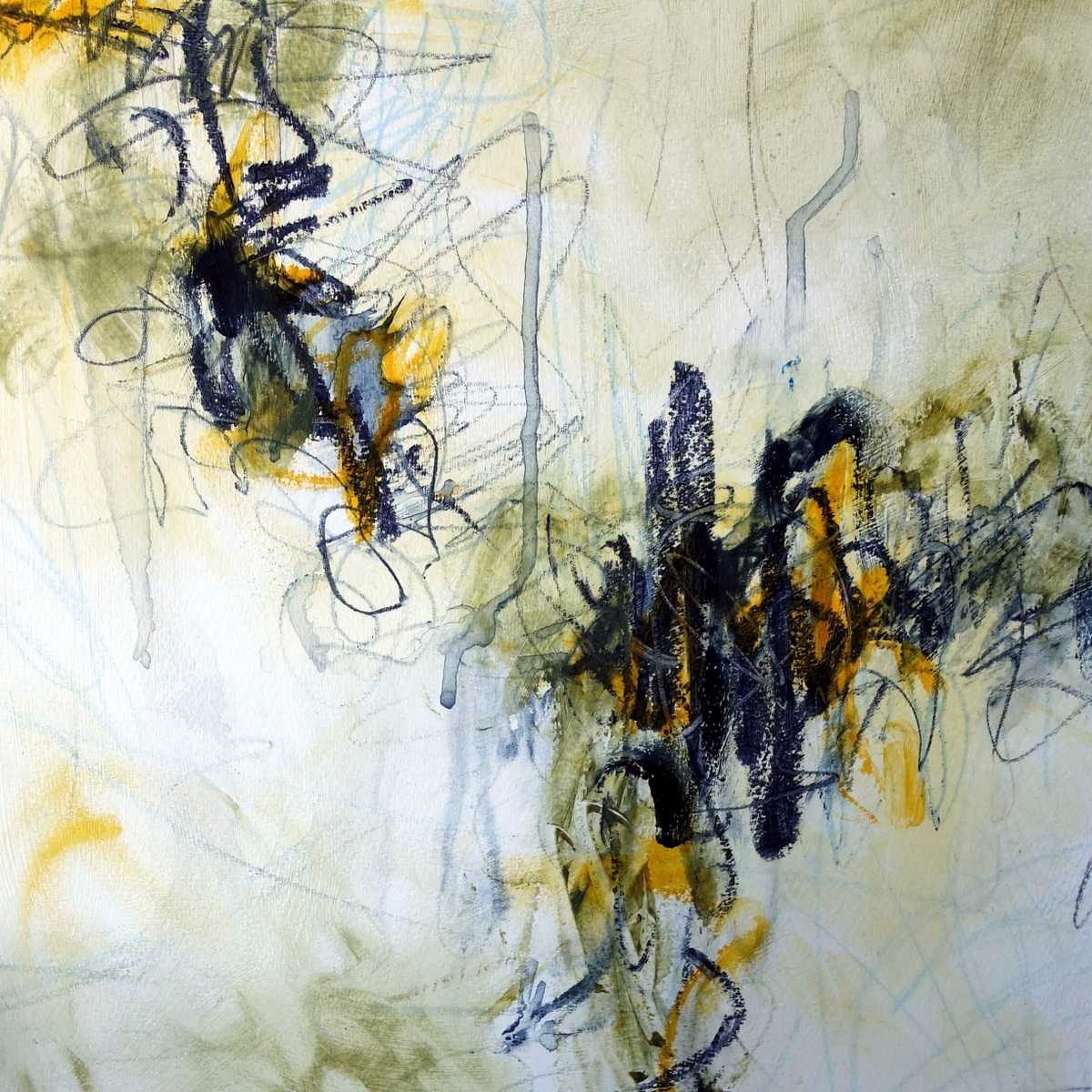 Working in a larger format on a wall allows use of my whole body to create gestural lines and marks. As usual I build up lots of layers of subtle lines and marks using a pre-determined limited palette. I work with a vague structure to get started. Oil sticks predominate, but crayons, oil pastels, oil paint with cold wax medium are also used.