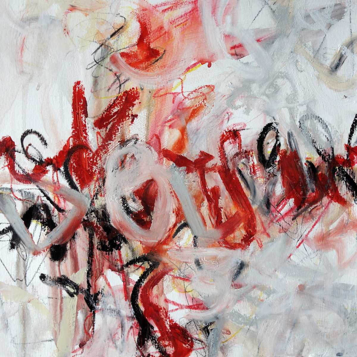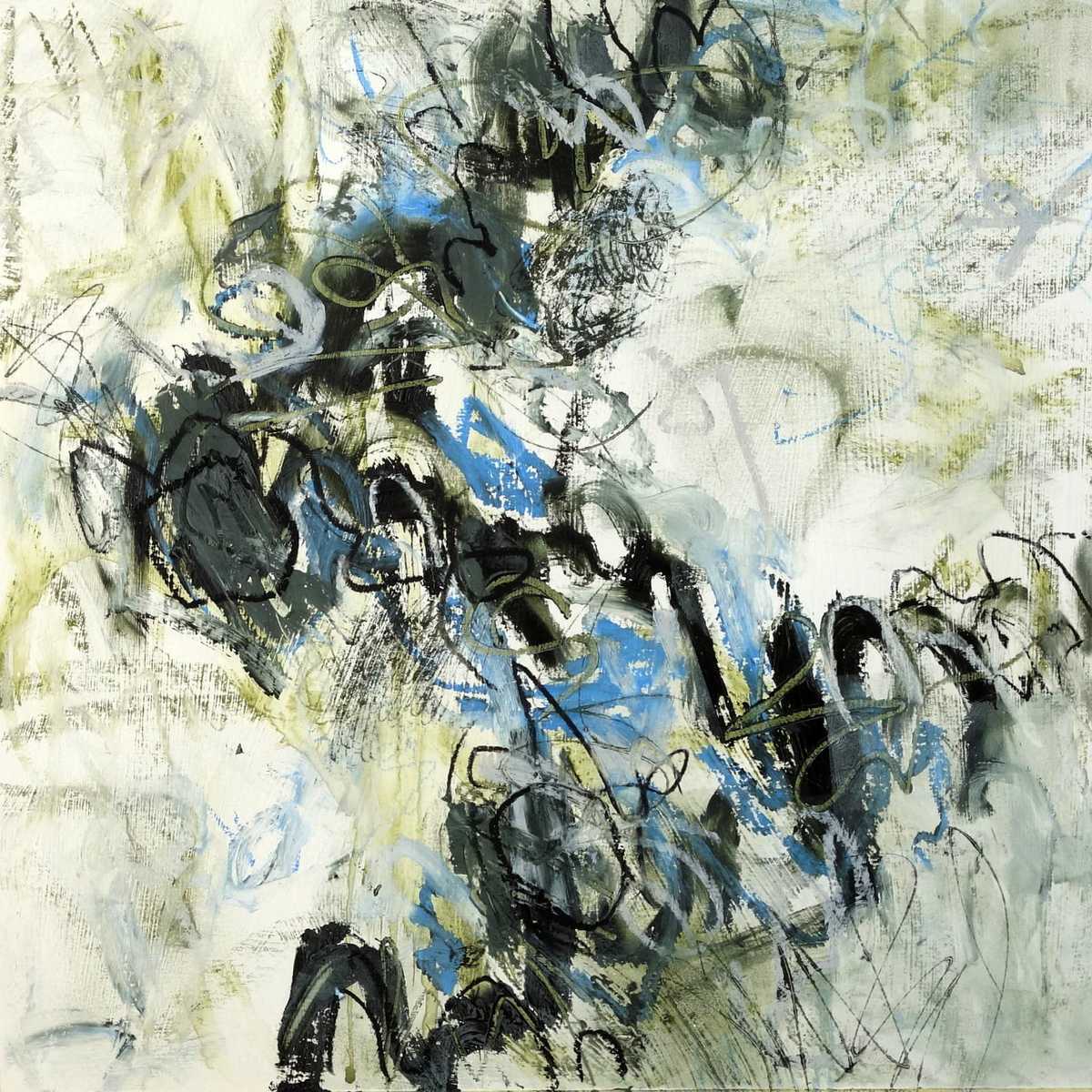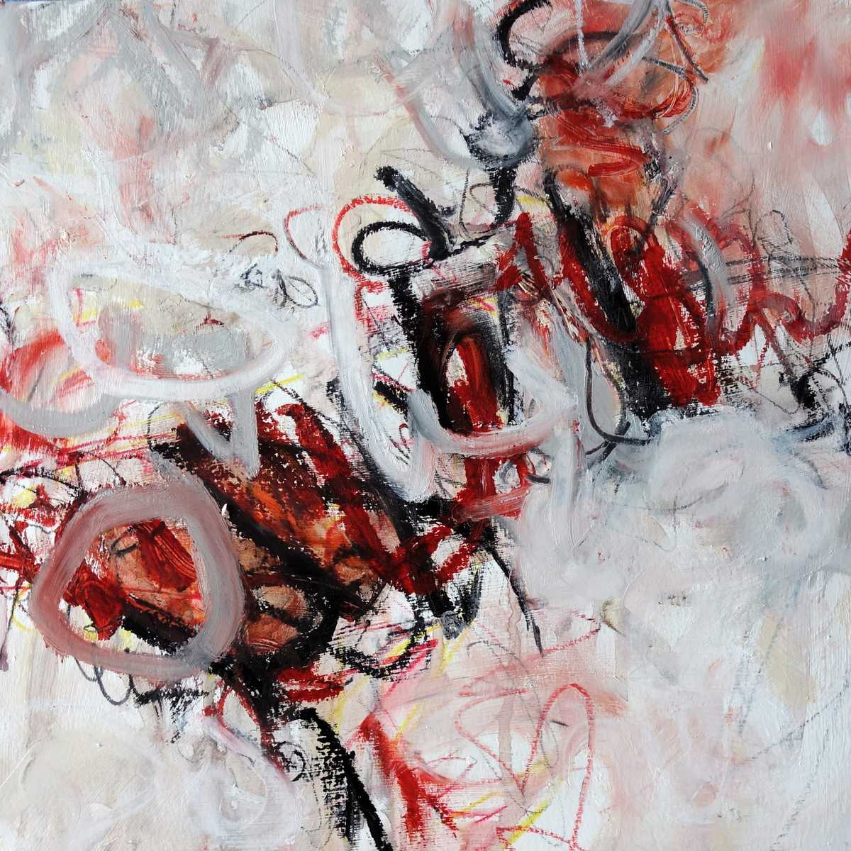 Working in a larger format on a wall allows use of my whole body to create gestural lines and marks. As usual I build up lots of layers of subtle lines and marks using a pre-determined limited palette. I work with a vague structure to get started. Oil sticks predominate, but crayons, oil pastels, oil paint with cold wax medium are also used.